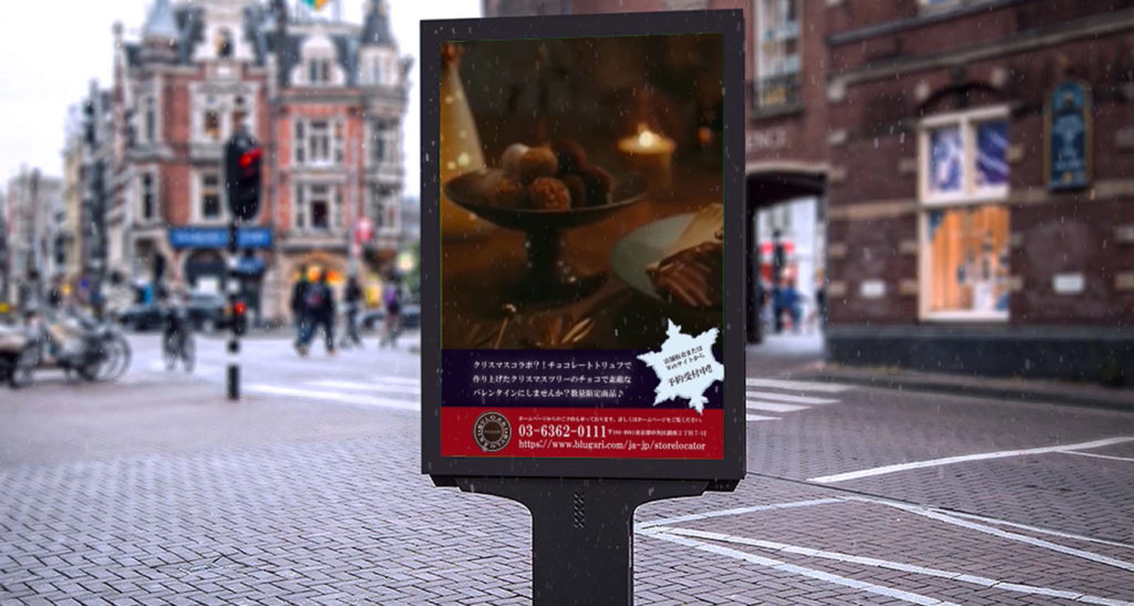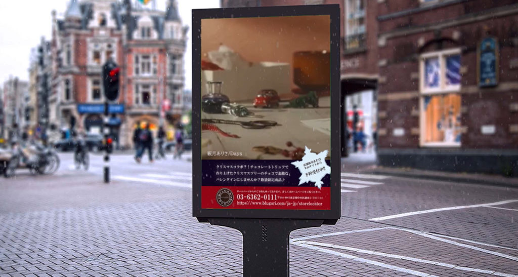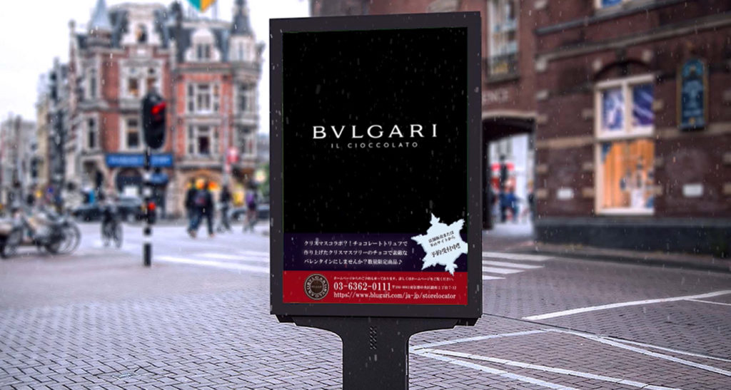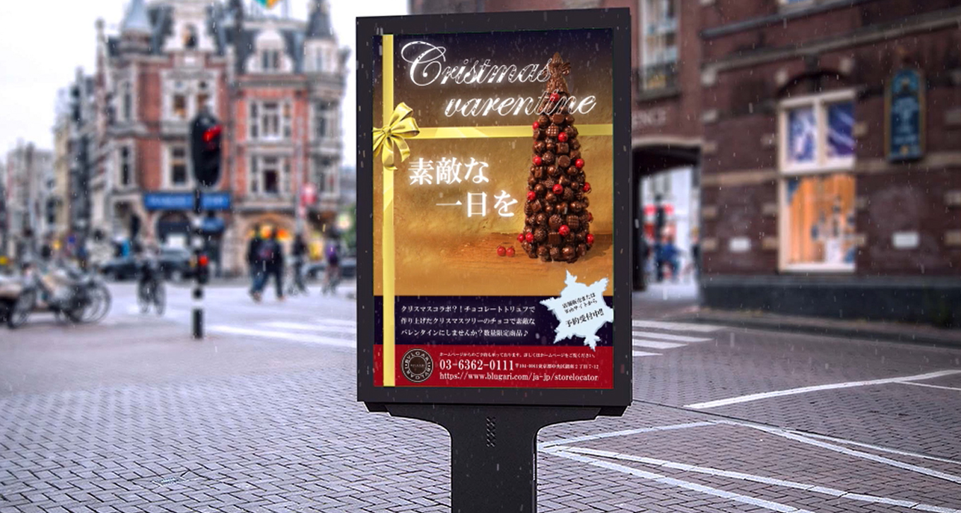 冬の街角に設置されたデジタルサイネージ広告風に展開される、ブルガリの季節限定チョコレート告知ムービー。商品の魅力を情緒的な映像と音楽で表現しました。