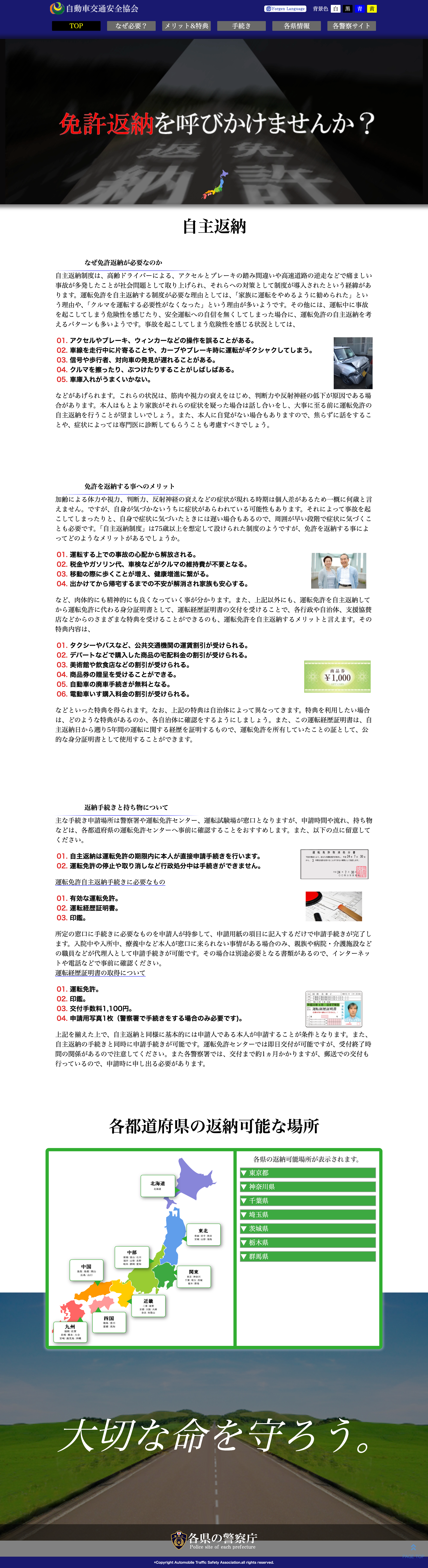 高齢ドライバーによる事故防止を目的とした、免許返納の啓発サイトを制作。免許返納の必要性や手続き方法をわかりやすく伝えることを重視し、高齢者本人とその家族が安心して行動を起こせる設計を行いました。