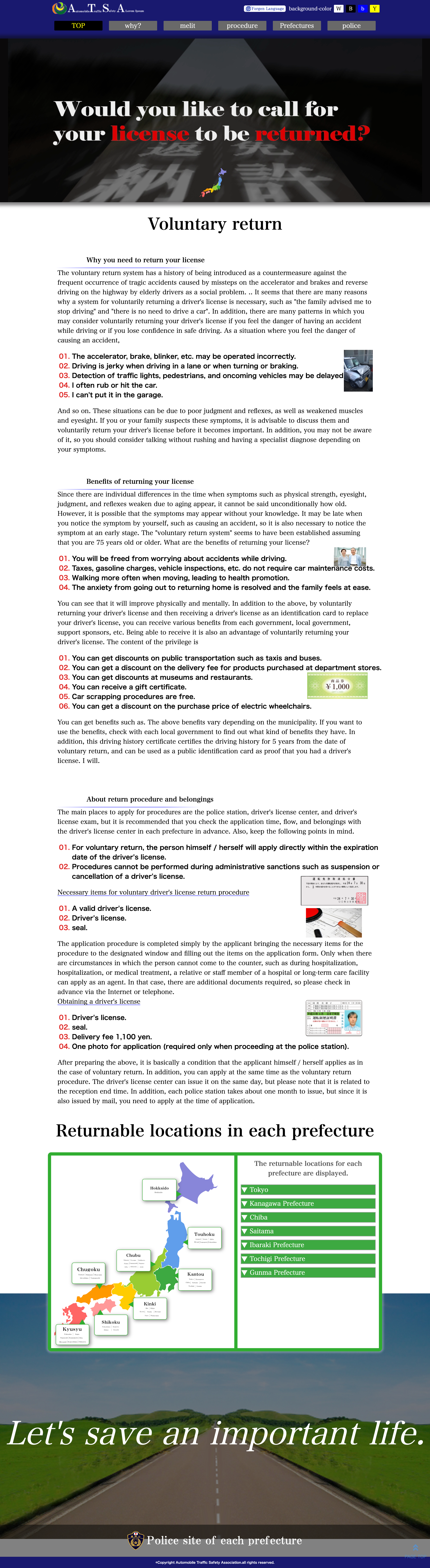 高齢ドライバーによる事故が社会問題となる中、免許返納を促進するための正確で分かりやすい情報提供を目的に制作。本人だけでなく、家族や周囲の人も閲覧しやすい構成にすることで、「返納を考えるきっかけ」を提供することを狙いました。また、英語ページも併設することで、外国籍の介護職・家族のサポートや多言語対応が求められる地域環境にも配慮しています。