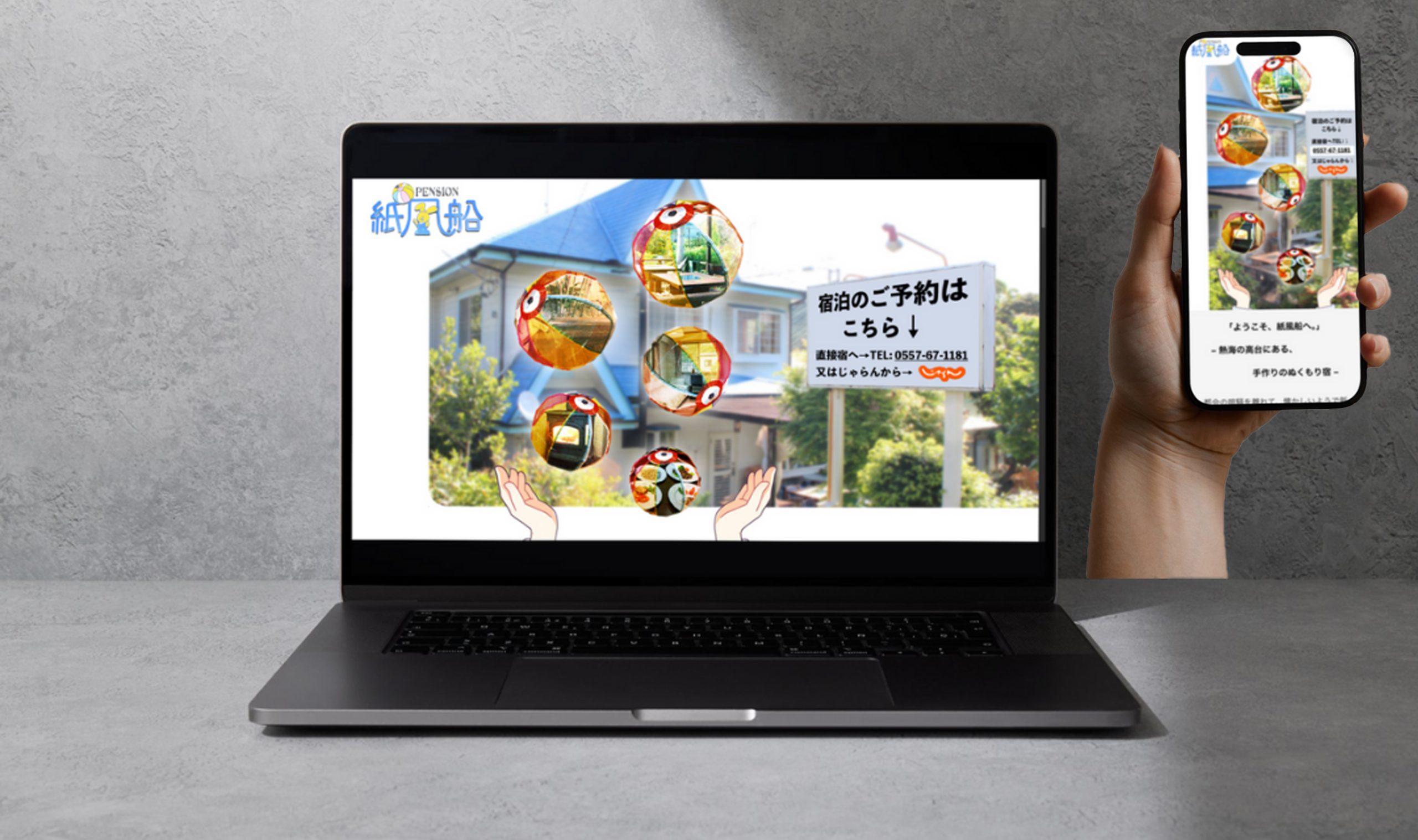 静岡県熱海市にある宿泊施設「やすらぎペンション 紙風船」のサイトを制作。温かみのある雰囲気と安心できる場所を伝えるデザインを意識し、施設の魅力やこだわりが丁寧に伝わるように構成しました。